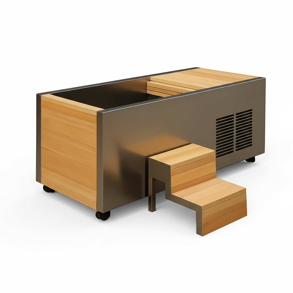 The Frostline Atlas Pro Integrated Cold Plunge is designed for those who demand the best. This premium plunge features a brushed stainless cabinet with an integrated side chiller behind precision venting, a digital temperature display, and modular cedar steps. With a seamless 316L stainless basin, fast pull-down cooling, and quiet operation on adjustable feet, it delivers consistent, crystal-clear cold therapy in a sleek, modern footprint.