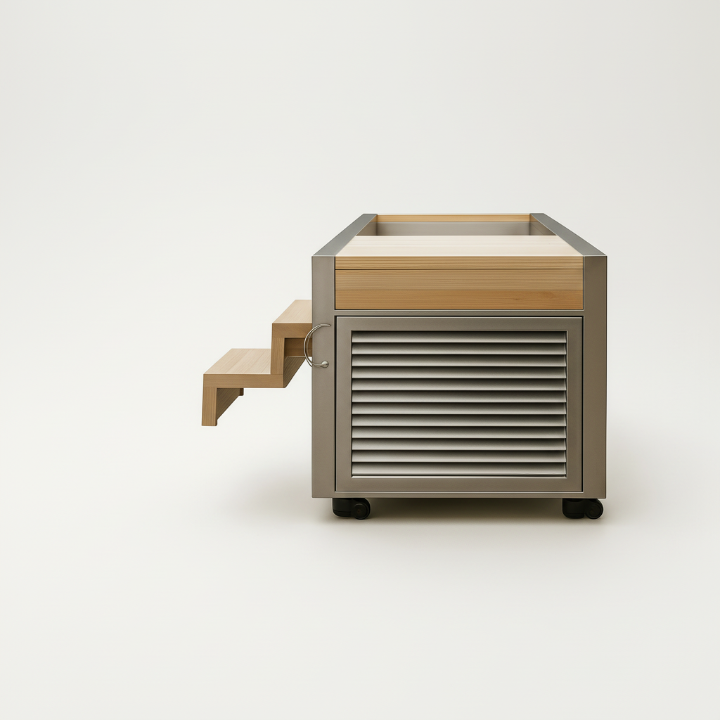 Material: Brushed stainless cabinet, 316L stainless basin, cedar steps and deck panels, closed-cell insulation